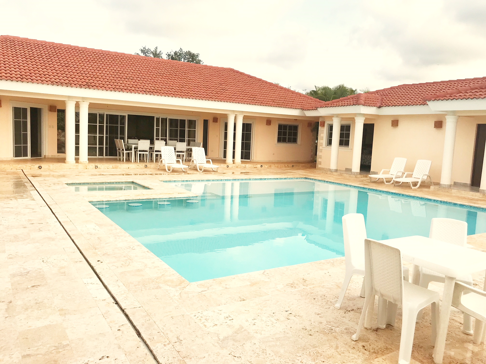 Большая вилла с шестью спальными комнатами в закрытом коттеджном поселке в Сосуа. Площадь виллы 338 м.кв. Каждая из шести спален имеет свой санузел, спальни с кондиционерами и имееют отдельные выходы к бассейну. Большая гостиная с высокими потолками, кухня из красного дерева, столовая, террасы с видом на океан. На террасе вторая кухня с барбекю. Вилла со вкусом меблирована, вся бытовая техника, интернет, кабельное ТВ. Участок земли 1200 м.кв., пальмы, газон, сад. Бассейн с джакузи, парковка для двух машин. Отличное место для отдыха. До центра Сосуа 5 минут. На территории поселка круглосуточная охрана, видеонаблюдение, ресторан, теннисный корт, поле для минигольфа, аквапарк. Цена 490 000$