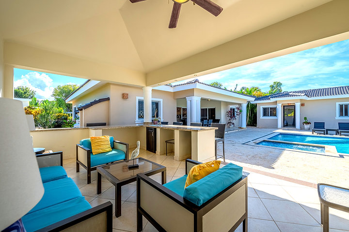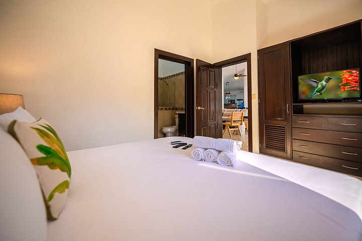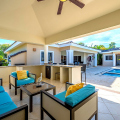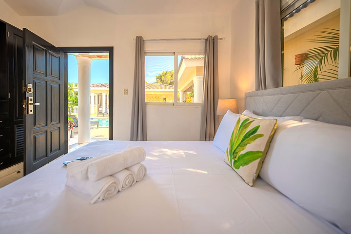 Когда вы выйдете во внутренний дворик, вокруг бассейна у вас будут 2 гостевые спальни с левой стороны и 1 гостевая спальня справа, а также терраса-палапа и закрытая прачечная.