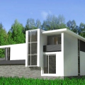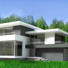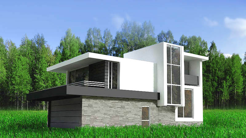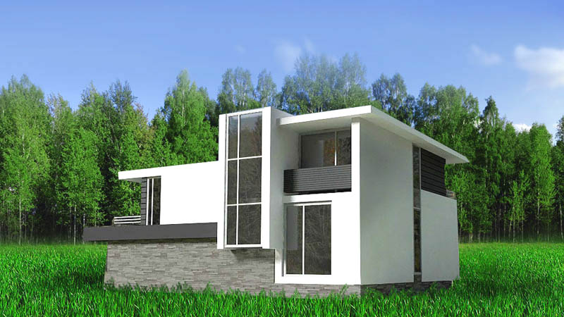 2-х этажный дом в стиле минимализма с большим панорамным окном. На первом этаже большая гостиная с кухней, на втором три спальные комнаты. Строительство под ключ за 8 месяцев. 1200$ за м2.
